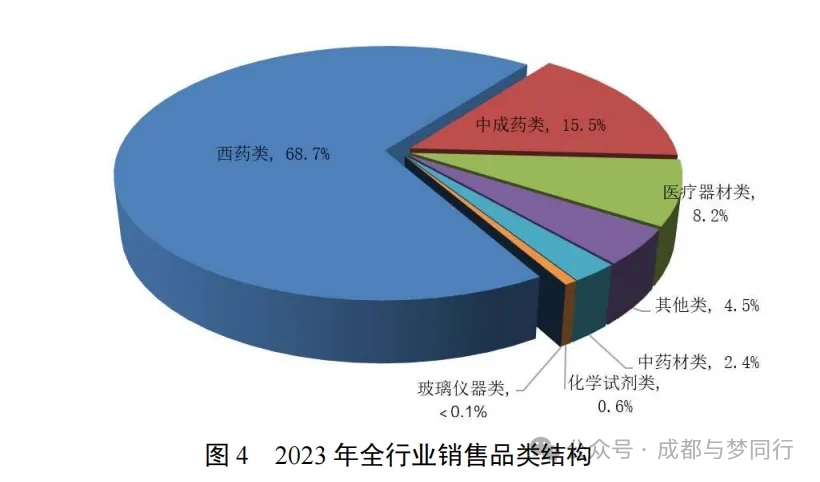 2023 年药品零售行业在销售品类方面呈现稳定态势。西药类药品依旧占据主导,销售额占七大类医药商品销售总额的 68.7%,受国家药品集采等因素影响,其销售占比较 2022 年下降 0.5 个百分点,但整体规模仍然庞大。中成药类药品占比 15.5%,中药材类占比 2.4%,这三类药品合计占比 86.6%,构成了药品零售行业的主要销售品类。
